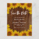 Une carte postale de date parfaite pour un mariage extérieur rustique avec un arrière - plan en bois foncé et agrémenté de tournesols jaune vif. Le design de la campagne offre de la calligraphie lettrée à la main.