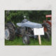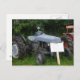 Une photographie de fond d'un vieux tracteur vintage bleu sombre avec un panneau fait à la main pour la vente appuyé contre l'avant, avec une pointe de tracteur rouge à côté. Idéal pour les amateurs vintages de fermes.