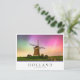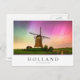 Photo postcard of a traditional windmill under a colorful sky with Northern Lights (aurora borealis) and stars at night in the countryside at Leidschendam in the Netherlands (Europe) with the text 'Holland, Leidschendam' in a white box and with stripes in red, white and blue, the colors of the Dutch flag.