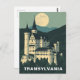 A dramatic vintage travel postcard featuring the legendary Castle in Transylvania, Romania. This Gothic illustration captures the medieval fortress under a spooky full moon, perfect for fans of historical sites and dark fantasy.