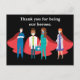 Remerciez vos travailleurs de la santé en les représentant en super-héros avec des capes rouges sur une carte postale noire. Merci d'être nos héros pendant une pandémie et de risquer vos vies pour sauver les nôtres. Nous apprécions tous les premiers intervenants en première ligne. Chaque médecin et infirmière mérite notre respect. Envoyez-leur une carte postale de gratitude.