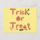 Ces cartes postales d'Halloween amusantes comprennent les mots, Trick ou Treat. Les mots comprennent un balai, des jambes de sorcière, des motifs de bonbons et une citrouille. Les mots sont d'orange pâle, encadrés d'une orange rouge. La lettre k est faite d'un balai et de jambes de sorcière portant des bas rayés. Un étalage de bonbons est représenté sous les mots. La couleur d'arrière-plan est jaune et elle peut être personnalisée à n'importe quelle couleur de votre sélection. Merci pour faire du shopping CherylsArt sur Zazzle.