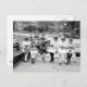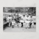Vieille photo de cinq filles et un garçon, assis sur un banc du parc, tricot. 1910 ou 1920. Vue patriotique avec étoiles et rayures motif sur tissu en photo. Probablement lié à WW1.