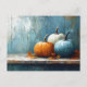 Une douce peinture impressionniste d'inspiration automnale agrémentée de trois citrouilles, orange, blanc et bleu, reposant sur une table en bois patinée. Des feuilles de chute chaudes et des brosses texturées rehaussent son charme rustique de ferme.