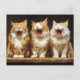 Trois chats drôles, mignons, orange et blancs assis sur une étagère en bois, la bouche grande ouverte, chantant la chanson de leur peuple.