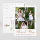 Cette élégante carte de remerciement de première communion catholique présente un collage de trois photos sur fond blanc avec une jolie typographie dorée, un doux message de remerciement éditable est au verso avec une simple croix dorée et l'adresse de retour. Cette carte de remerciement de première sainte eucharistie est éditable pour diverses occasions religieuses chrétiennes, ou pour mettre à jour votre propre message de remerciement personnel. Cette carte est également disponible en noir.