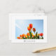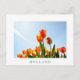 Carte postale avec fleurs composées de tulipes orange et rouge vue d'un point de vue bas sur un ciel bleu avec une bordure blanche et le texte 'Holland'.