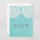 Simple et sophistiquée Elegant Lace Mariage Response Carte Postale avec un motif de dentelle blanche sur un arrière - plan de papier vintage bleu turquoise clair. Cette carte postale RSVP classique et élégante est parfaite pour un mariage rustique. Facile à customiser avec vos détails mariages. Cliquez sur "Customiser" pour trouver d'autres options de personnalisation.
