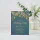 Carte postale d'invitation à la fête d'anniversaire customisée pour les femmes avec des lampes à cordes dorées scintillantes et un bokeh pétillant sur un arrière - plan turquoise audacieux. Le texte, les polices et le libellé sont entièrement personnalisables. Contactez-nous pour obtenir de l'aide sur la personnalisation ou la mise en correspondance de produits.
