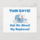 La fière nouvelle tante ou oncle de nouveaux neveux jumeaux va adorer notre Demander à propos de My Nephews Twin Boys T-shirts, sweat - shirts à capuche, tasses, cartes, autocollants, sacs fourre-tout, boutons de faire-part, et autres vêtements et cadeaux de neveux jumeaux.