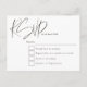 Un moyen pratique pour vos invités à RSVP à vos invitations est par carte postale avec vos coordonnées déjà là pour qu'ils puissent simplement compléter le front et le retourner dans le poste à vous. Cette élégante conception minimaliste a l'en-tête RSVP dans une police de script stylisée en brun foncé. Le reste du texte est facilement personnalisé, y compris les coordonnées de votre adresse de retour sur le devant. Vous pouvez également modifier la couleur du texte comestible et la couleur arrière - plan si vous le souhaitez via l'option Cliquez pour Customiser plus.