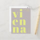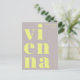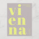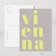Envoyez un salut élégant depuis Vienne en Autriche avec cette carte postale typographique moderne. Le design présente le mot Vienne réparti sur trois lignes en lettres minuscules décoratives et grasses, en jaune vif sur fond gris. Au-dessus, la phrase salutations de est écrite dans une police sans empattement fine et élégante, ajoutant une touche subtile et moderne. Parfait comme souvenir de vacances, accent décoratif, ou pour envoyer à la maison depuis votre ville préférée. Un design minimaliste mais accrocheur pour les amateurs d'esthétique contemporaine et de souvenirs de voyage.