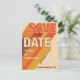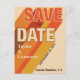 Une carte postale "save the date" branchée avec l'ambiance d'une affiche de concert. Un texte avec ombre portée et des bandes diagonales de différentes couleurs s'étend sur la carte en mettant l'accent sur le message "Save the Date". Une première impression unique et vraiment cool pour votre mariage avec des vibrations rétro - lorsque vos invités reçoivent cette carte postale, ils savent que l'amusement est au rendez-vous. Typographie en gras. Couleurs authentiques des années soixante-dix : orange brûlé, rouges et bruns. Typographie rétro en gras pour un effet années soixante-dix. Le verso de la carte est orange avec des accents rayés dans les coins, un endroit où vous pouvez ajouter plus d'informations, et un QR code pour que les invités puissent visiter votre site web de mariage.