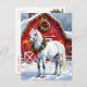 Une jolie carte postale de Noël avec l'illustration d'un cheval blanc debout devant une magnifique grange rouge ornée de lumières de Noël et d'une couronne festive pendant une journée d'hiver enneigée. Au verso, vous pouvez ajouter votre adresse et votre salutation personnalisée dans la zone personnalisée.