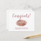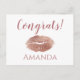 Une félicitation chic, cette carte postale présente une belle paire de lèvres au milieu. Au-dessus des lèvres est écrit "Félicitations" dans une belle police mauve cursive avec son nom écrit sous le design. Cela fait une excellente carte postale pour une nouvelle mère, une femme nouvellement fiancée, une femme nouvellement mariée ou une femme qui célèbre une promotion au travail, une remise de diplôme, etc. Personnalisez la vôtre dès aujourd'hui !