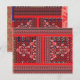 Le design semble être un design textile, peut-être pour tissu ou papier peint. Voici une description détaillée : Top Section : Il a un arrière - plan rouge avec des rayures verticales noires et blanches, entrecoupées de motifs complexes qui ressemblent à des motifs traditionnels ou tribaux. Bande centrale : Cette section présente des formes zigzag et diamant en noir, blanc et des tons marron, flanqués de fines bandes verticales. Section inférieure : Il montre un motif orné, cachemire, dans les tons rouges avec un motif central qui reflète la forme de la section supérieure mais dans des détails plus élaborés. Le design est assez complexe et saisissant visuellement, avec un mélange de motifs géométriques et organiques. Elle pourrait avoir une importance culturelle, surtout dans le contexte de la conception textile.