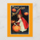 Carte classique d'Halloween vintage montrant une petite fille habillée d'un casquette rouge et d'un manteau entouré de quatre citrouilles et nous souhaitant "A Jolly Halloween".