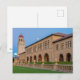 L'image montre une vue détaillée de l'architecture de l'Université de Stanford à la tombée de la nuit. Le bâtiment est construit en pierre marron clair, avec des allées voûtées et de nombreuses fenêtres. La tour Hoover avec un dôme rouge s'élève dans l'arrière - plan, illuminé contre le ciel crépusculaire. Une pleine lune est visible au-dessus du bâtiment.