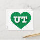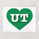 Cette carte postale présente un coeur vert respectueux de l'environnement contenant les lettres coques UT, en haut blanc et audacieuses, l'abréviation officielle de l'Utah, l'état de ruche. Le verso de la carte postale est vide, en attendant votre texte customisé ou vos sentiments manuscrits.