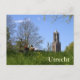 Photo de deux personnes assises sur un banc dans un parc d'Utrecht (la Pays-Bas), avec vue sur la tour de l'église Dom.