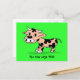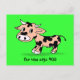 Just Fun series A cartoon cow with cute little horns and covered in a patchwork of black irgular patches. It's on a bright green background and the cow is a friesian / Holstein mix . Image code: moocow1