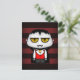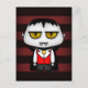 Joli vampire de dessin animé avec de grands yeux de chat jaune, habillé d'un gilet rouge et d'une cape noire.
