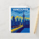 Celebrate the stunning West Coast with this vibrant, vintage-style postcard! It features a dynamic illustration of the Vancouver skyline, dominated by the Harbour Centre Tower and set against the dramatic backdrop of the Coastal Mountains and a yellow-lit bridge. The rich blue and yellow color palette perfectly captures the modern energy and natural beauty of Vancouver, British Columbia, Canada. A stylish piece for travelers, B.C. residents, or fans of bold, graphic cityscapes.