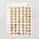 Variations d'un émoticon facial, dont certaines sont les suivantes : heureux, fou, triste, en colère, souriant, riant, surpris, écoutant de la musique, Dracula, applaudissements, pirate, applaudissements, amoureux, pleurant, un oeil, lève le pied, fatigué, confus, endormi, chut, parlant au téléphone, embarrassé, sifflant, mal, malade, et ainsi de suite.