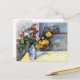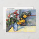 Une carte postale d'art avec la peinture post-impressionniste de l'artiste français Paul Cézanne, (1839-1906), Still Life Flowers in a Vase (1888). Une nature morte avec des roses rouges et jaunes disposées dans un vase en porcelaine bleu et blanc à motifs sur une table.