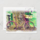 Un vélo antique se penche sur un arbre avec une boîte de fleurs en bois dans le panier avant. Il est là depuis un moment, à en juger par les algues et la moisissure coloriant le cadre de vélo métallique et les défenses vertes. Photo couleur numériquement améliorée.
