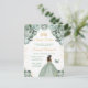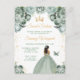 Cette invitation élégante et glamour pour un sweet sixteen met en vedette une belle princesse à la peau foncée portant une robe de bal vert sauge. Le texte combine une écriture manuscrite et des polices sans empattement modernes pour un rendu chic et sophistiqué. Les arrangements floraux, le papillon et les confettis dorés créent le mélange parfait entre rustique et chic.