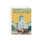 A charming vintage-style travel poster for Victoria, British Columbia, Canada. This artwork showcases the grand Parliament Building and a traditional horse-drawn carriage—iconic symbols of the city. The bold, yellow and teal palette gives the design a bright, retro feel. It's the perfect postcard for travel lovers, fans of Canadian scenery and history, or anyone collecting classic architecture and Art Deco-inspired designs.