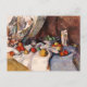 Une carte postale d'art avec le tableau de l'artiste franco-postimpressionniste Paul Cézanne (1839-1906), Still Life with Apples (vers 1898). Tout au long de sa carrière, la vie a été un thème majeur. Il plaçait les objets avec soin, passant des heures à les positionner. Cette nature morte présente plusieurs fruits sur une table avec un rideau en toile de fond.