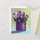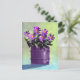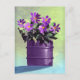 Cette conception est une peinture acrylique sur toile. Mes combinaisons de couleurs préférées sont le violet et le vert, et le bleu clair et le vert. J'adore que les deux se soient mis sur cette pièce. Le tableau présente un bouquet de fleurs violettes dans une boîte de café.