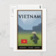 Belle image de voyage du Vietnam représentant un riziculteur dans le champ dressé contre des montagnes bleues.