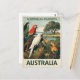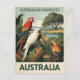 A colorful, vintage-style travel poster featuring an artistic illustration of Australian wildlife in a lush landscape. The design showcases several native parrots and a cockatoo perched amongst tropical foliage, with a peaceful scene of a person by a waterhole in the background. This retro-inspired artwork is perfect wall décor for travel enthusiasts, bird lovers, fans of Australian nature, and those who appreciate the bold aesthetics of mid-century modern or wildlife prints.