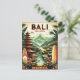 • This retro-style travel postcard captures the beauty of Bali, Indonesia, featuring lush green rice terraces, tropical palm trees, traditional Balinese architecture, and a majestic volcano under a serene sky.