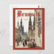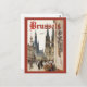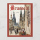 Cette affiche de voyage vintage capture la scène de rue animée de Bruxelles, Belgique. Le design comprend un carré avec des bâtiments historiques et des personnes habillées de vêtements d'époque, avec une cathédrale et un avion au-dessus. Le style d'illustration détaillé rappelle l'âge d'or de l'art voyageur européen.
