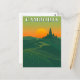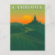 Illustration d'inspiration vintage du Cambodge au coucher du soleil, avec des terrasses de riz verdoyantes et une silhouette de temple à l'horizon. Parfait comme carte postale, souvenir ou cadeau de voyage pour les collectionneurs de monuments et de destinations culturelles du monde entier.