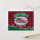 Cette carte de vœux de fêtes de fin d'année présente une scène hivernale avec un camion pickup rouge classique qui traverse la neige avec un sapin de Noël frais à l'arrière. Une bannière verte au-dessus indique "Amour & Merci" avec votre nom de famille en dessous pour personnaliser. Le fond est un motif classique à carreaux rouges et noirs de buffle et une rangée de pins verts.