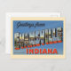 Cette carte postale vintage, qui est une pièce étonnante d'art de voyage rétro, présente le design à grande lettre "Greming from" pour Evansville, Indiana. Cette carte de collection est rendue dans une palette éclatante de bleu, rouge et blanc profond, ce qui lui donne un charme Americana intemporel. Chaque lettre de bloc de "EVANSVILLE" présente un point de repère différent et une vue pittoresque d'Evansville, y compris : Le beau front de mer de l'Ohio River. Architecture du centre-ville historique et clochers d'église. Des ponts importants d'Evansville relient les rives de la rivière. Ce style est caractéristique des cartes postales Curt Teich & Co., très collectionnables (indiquées sur la carte), ce qui en fait une trouvaille précieuse pour les collectionneurs de cartes postales. Il est parfait pour les autochtones de l'Indiana, les anciens résidents, les touristes ou toute personne qui cherche à ajouter un art unique et nostalgique à leur décor de maison ou de bureau.