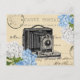 Un grand appareil photo vintage avec de belles hydrangées vintages et feuilles bleues et blanches est placé sur une carte postale vintage française en crème sépia avec écriture et postmarks pour faire une belle carte postale à thème floral français.