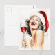 Une étonnante aquarelle d'une femme classique de style vintage, ornée d'un chapeau de Père Noël, rayonnant de joie en riant en tenant un verre de vin rouge. Ses lèvres rouges glamour, ses cheveux parfaitement coiffés et son élégante attitude incarnent une joie de vacances intemporelle avec une touche de charme rétro.