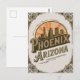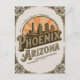 Logo de style vintage avec le nom de la ville "PHOENIX" en caractères gras et stylisés. Le mot "ARIZONA" est affiché dans une police plus petite et complémentaire sous "PHOENIX". Le logo est entouré de fleurs décoratives et d'un design de coup de soleil, créant une esthétique classique et intemporelle. La palette de couleurs est chaleureuse et accueillante, avec des tons marron, orange et crème.