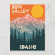 Une affiche de voyage dynamique et de style vintage pour Sun Valley, Idaho. L'aménagement comprend un majestueux sommet enneigé, surmonté d'un ciel orangé et chaud, avec un grand soleil. Au premier plan, une forêt dense d'arbres à feuillage persistant est représentée dans des tons cool et stylisés. Cette illustration rétro saisit la beauté des montagnes de l'Idaho et l'esprit d'aventure en plein air de la vallée du Soleil, ce qui en fait un lieu de séjour idéal pour les amateurs de ski, de randonnée et de nature. C'est une grande oeuvre d'art pour la décoration cabine ou pour ceux qui apprécient les affiches de voyage classiques.