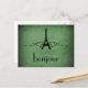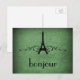 Grungy mais élégant Vintage French Flourish Postcard en vert de forêt avec un design tour Eiffel agrémenté de tourbillons et de points chic et d'un arrière - plan texturé en faux papier. Cette carte postale à thème parisienne unique est parfaite pour envoyer un bonjour rapide à tous ceux qui ont un soupçon de fantaisie française ! Facile à customiser, ajoutez simplement le texte personnalisé de votre choix dans le champ de texte fourni. Cliquez sur le bouton "Customiser" pour trouver d'autres options de personnalisation.