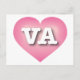Cette carte postale présente un coeur rose cool avec un centre lavé blanc contenant les lettres chaudes blanches et coques supérieures VA, l'abréviation officielle de Virginie, l'ancien état dominion. Le verso de la carte est vide, en attendant votre texte personnalisé ou vos sentiments manuscrits.