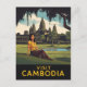 Cette affiche de voyage de style vintage capture magnifiquement la beauté intemporelle d'Angkor Vat, site classé au patrimoine mondial de l'UNESCO au Cambodge. Le design comprend une femme reposant dans une zone herbeuse avec le magnifique complexe de temple et une piscine réfléchissante dans l'arrière - plan. Le style artistique, avec ses lignes audacieuses et ses couleurs riches, évoque l'âge d'or de la publicité de voyage. Le texte simple, "Visit Cambodia" ajoute un style classique et rétro.