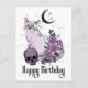 Carte de vœux d'anniversaire gothique. Chat de style gothique avec croissant de lune, crâne et roses dans une palette de couleurs noire et violette que votre fille gothique adorera. Personnalisez le champ de texte pour une carte d'anniversaire vraiment magique.