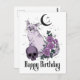 Carte de vœux d'anniversaire gothique. Chat de style gothique avec croissant de lune, crâne et roses dans un schéma de couleurs noir et violet que votre fille gothique adorera. Personnalisez le champ de texte à l'intérieur pour une carte d'anniversaire vraiment magique.